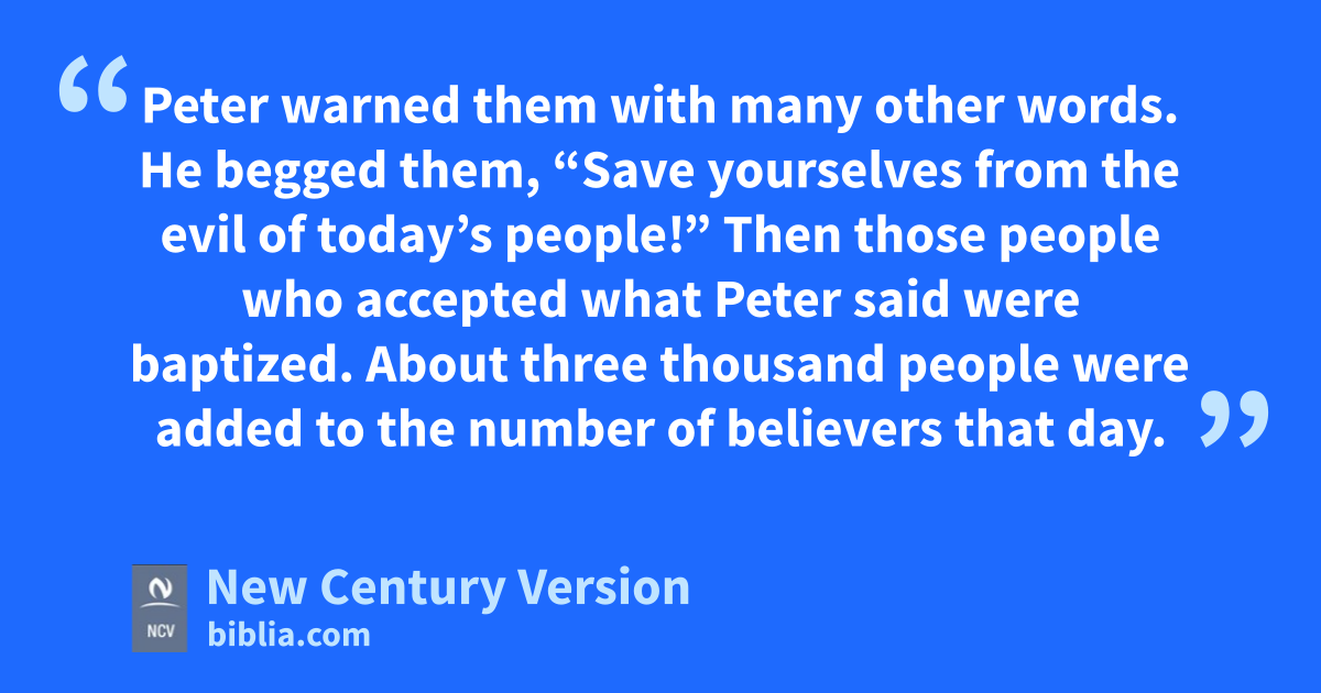 40 Peter warned them with many other words. He begged them, “Save yourselves from the evil of today’s people!” 41 Then those people who accepted what Peter said were baptized. About three thousand people were added to the number of believers that day. 42 They spent their time learning the apostles’ teaching, sharing, breaking bread, n and praying together.