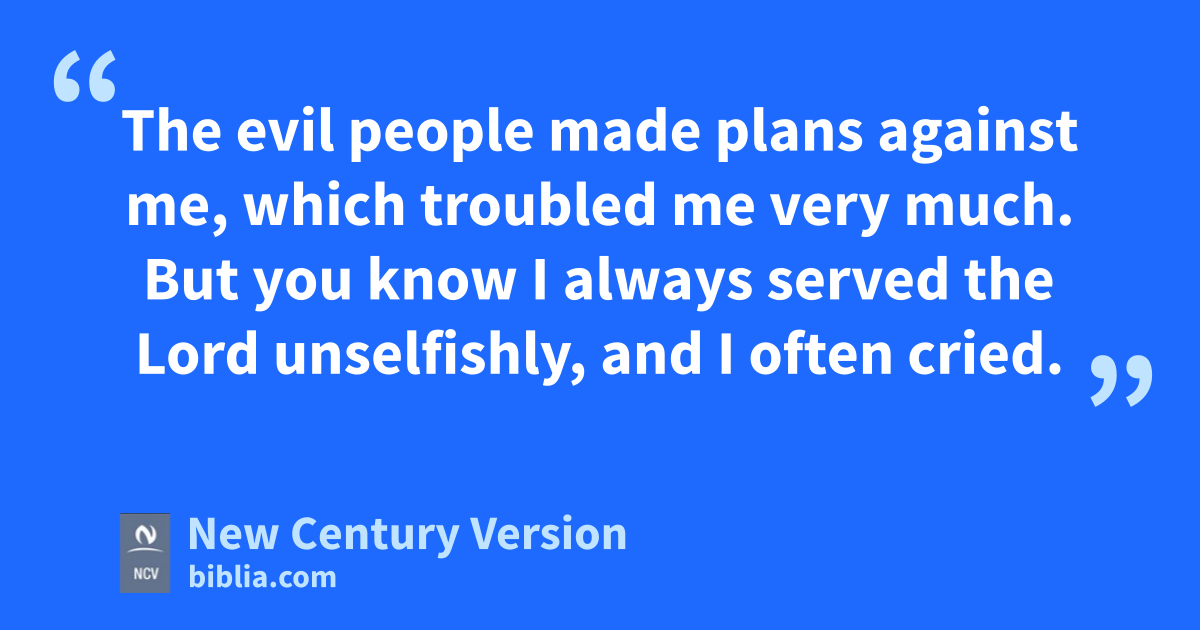 17 Now from Miletus Paul sent to Ephesus and called for the elders of the church. 18 When they came to him, he said, “You know about my life from the first day I came to Asia. You know the way I lived all the time I was with you. 19 The evil people made plans against me, which troubled me very much. But you know I always served the Lord unselfishly, and I often cried. 20 You know I preached to you and did not hold back anything that would help you. You know that I taught you in public and in your homes. 21 I warned both Jews and Greeks to change their lives and turn to God and believe in our Lord Jesus. 22 But now I must obey the Holy Spirit and go to Jerusalem. I don’t know what will happen to me there. 23 I know only that in every city the Holy Spirit tells me that troubles and even jail wait for me. 24 I don’t care about my own life. The most important thing is that I complete my mission, the work that the Lord Jesus gave me—to tell people the Good News about God’s grace.