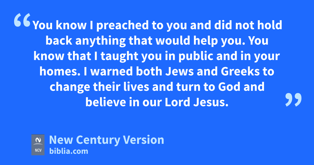 17 Now from Miletus Paul sent to Ephesus and called for the elders of the church. 18 When they came to him, he said, “You know about my life from the first day I came to Asia. You know the way I lived all the time I was with you. 19 The evil people made plans against me, which troubled me very much. But you know I always served the Lord unselfishly, and I often cried. 20 You know I preached to you and did not hold back anything that would help you. You know that I taught you in public and in your homes. 21 I warned both Jews and Greeks to change their lives and turn to God and believe in our Lord Jesus. 22 But now I must obey the Holy Spirit and go to Jerusalem. I don’t know what will happen to me there. 23 I know only that in every city the Holy Spirit tells me that troubles and even jail wait for me. 24 I don’t care about my own life. The most important thing is that I complete my mission, the work that the Lord Jesus gave me—to tell people the Good News about God’s grace.
