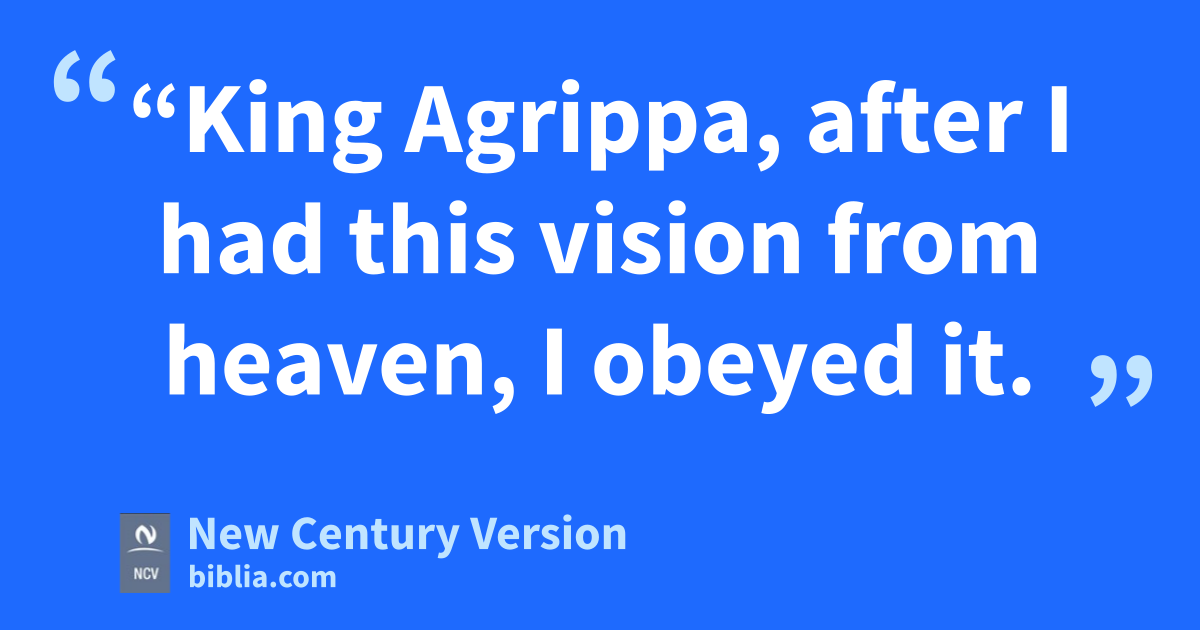 19 “King Agrippa, after I had this vision from heaven, I obeyed it. 20 I began telling people that they should change their hearts and lives and turn to God and do things to show they really had changed. I told this first to those in Damascus, then in Jerusalem, and in every part of Judea, and also to the other people. 21 This is why the Jews took me and were trying to kill me in the Temple. 22 But God has helped me, and so I stand here today, telling all people, small and great, what I have seen. But I am saying only what Moses and the prophets said would happen—23 that the Christ would die, and as the first to rise from the dead, he would bring light to all people.”