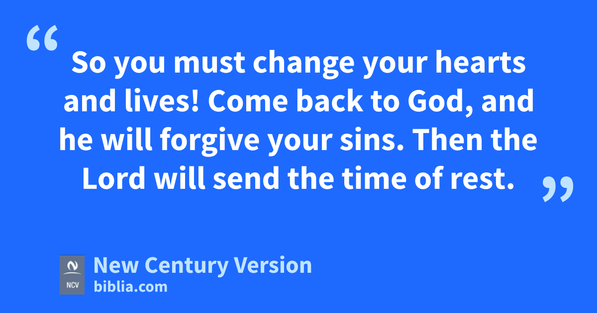 17 “Brothers and sisters, I know you did those things to Jesus because neither you nor your leaders understood what you were doing. 18 God said through the prophets that his Christ would suffer and die. And now God has made these things come true in this way. 19 So you must change your hearts and lives! Come back to God, and he will forgive your sins. Then the Lord will send the time of rest. 20 And he will send Jesus, the One he chose to be the Christ. 21 But Jesus must stay in heaven until the time comes when all things will be made right again. God told about this time long ago when he spoke through his holy prophets. 22 Moses said, ‘The Lord your God will give you a prophet like me, who is one of your own people. You must listen to everything he tells you. 23 Anyone who does not listen to that prophet will die, cut off from God’s people.’ n 24 Samuel, and all the other prophets who spoke for God after Samuel, told about this time now. 25 You are descendants of the prophets. You have received the agreement God made with your ancestors. He said to your father Abraham, ‘Through your descendants all the nations on the earth will be blessed.’ n 26 God has raised up his servant Jesus and sent him to you first to bless you by turning each of you away from doing evil.”