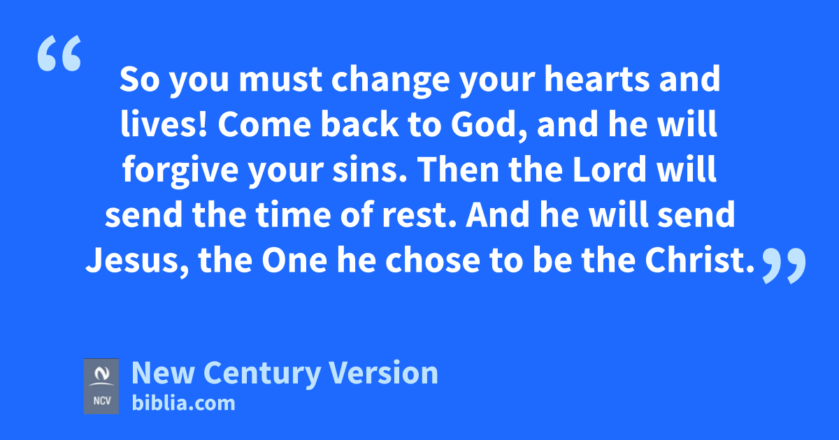17 “Brothers and sisters, I know you did those things to Jesus because neither you nor your leaders understood what you were doing. 18 God said through the prophets that his Christ would suffer and die. And now God has made these things come true in this way. 19 So you must change your hearts and lives! Come back to God, and he will forgive your sins. Then the Lord will send the time of rest. 20 And he will send Jesus, the One he chose to be the Christ. 21 But Jesus must stay in heaven until the time comes when all things will be made right again. God told about this time long ago when he spoke through his holy prophets. 22 Moses said, ‘The Lord your God will give you a prophet like me, who is one of your own people. You must listen to everything he tells you. 23 Anyone who does not listen to that prophet will die, cut off from God’s people.’ n 24 Samuel, and all the other prophets who spoke for God after Samuel, told about this time now. 25 You are descendants of the prophets. You have received the agreement God made with your ancestors. He said to your father Abraham, ‘Through your descendants all the nations on the earth will be blessed.’ n 26 God has raised up his servant Jesus and sent him to you first to bless you by turning each of you away from doing evil.”