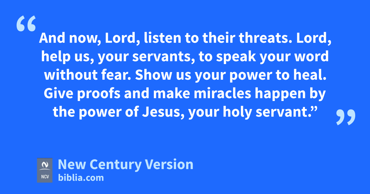 27 These things really happened when Herod, Pontius Pilate, and some Jews and non-Jews all came together against Jesus here in Jerusalem. Jesus is your holy servant, the One you made to be the Christ. 28 These people made your plan happen because of your power and your will. 29 And now, Lord, listen to their threats. Lord, help us, your servants, to speak your word without fear. 30 Show us your power to heal. Give proofs and make miracles happen by the power of Jesus, your holy servant.”