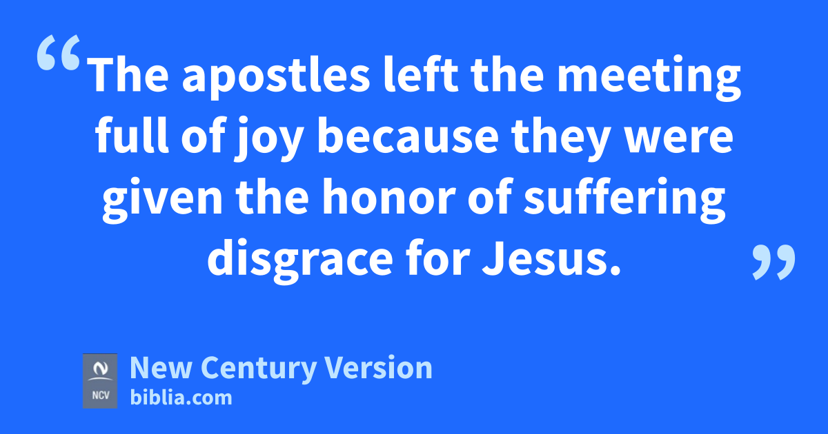 The leaders agreed with what Gamaliel said. 40 They called the apostles in, beat them, and told them not to speak in the name of Jesus again. Then they let them go free. 41 The apostles left the meeting full of joy because they were given the honor of suffering disgrace for Jesus. 42 Every day in the Temple and in people’s homes they continued teaching the people and telling the Good News—that Jesus is the Christ.