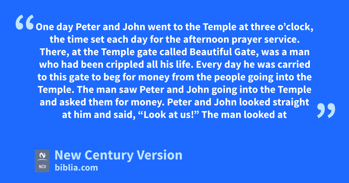 3 One day Peter and John went to the Temple at three o’clock, the time set each day for the afternoon prayer service. 2 There, at the Temple gate called Beautiful Gate, was a man who had been crippled all his life. Every day he was carried to this gate to beg for money from the people going into the Temple. 3 The man saw Peter and John going into the Temple and asked them for money. 4 Peter and John looked straight at him and said, “Look at us!” 5 The man looked at them, thinking they were going to give him some money. 6 But Peter said, “I don’t have any silver or gold, but I do have something else I can give you. By the power of Jesus Christ from Nazareth, stand up and walk!” 7 Then Peter took the man’s right hand and lifted him up. Immediately the man’s feet and ankles became strong. 8 He jumped up, stood on his feet, and began to walk. He went into the Temple with them, walking and jumping and praising God. 9–10 All the people recognized him as the crippled man who always sat by the Beautiful Gate begging for money. Now they saw this same man walking and praising God, and they were amazed. They wondered how this could happen.