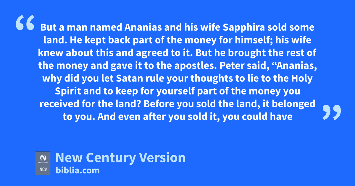 5 But a man named Ananias and his wife Sapphira sold some land. 2 He kept back part of the money for himself; his wife knew about this and agreed to it. But he brought the rest of the money and gave it to the apostles. 3 Peter said, “Ananias, why did you let Satan rule your thoughts to lie to the Holy Spirit and to keep for yourself part of the money you received for the land? 4 Before you sold the land, it belonged to you. And even after you sold it, you could have used the money any way you wanted. Why did you think of doing this? You lied to God, not to us!” 5–6 When Ananias heard this, he fell down and died. Some young men came in, wrapped up his body, carried it out, and buried it. And everyone who heard about this was filled with fear.