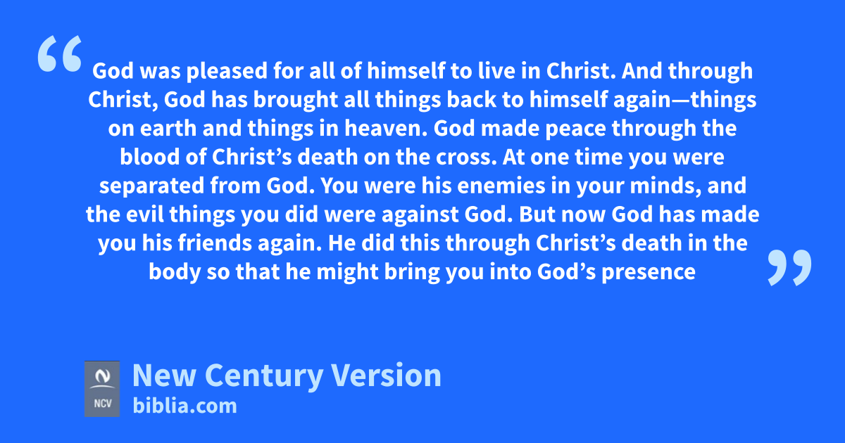 21 At one time you were separated from God. You were his enemies in your minds, and the evil things you did were against God. 22 But now God has made you his friends again. He did this through Christ’s death in the body so that he might bring you into God’s presence as people who are holy, with no wrong, and with nothing of which God can judge you guilty. 23 This will happen if you continue strong and sure in your faith. You must not be moved away from the hope brought to you by the Good News that you heard. That same Good News has been told to everyone in the world, and I, Paul, help in preaching that Good News.