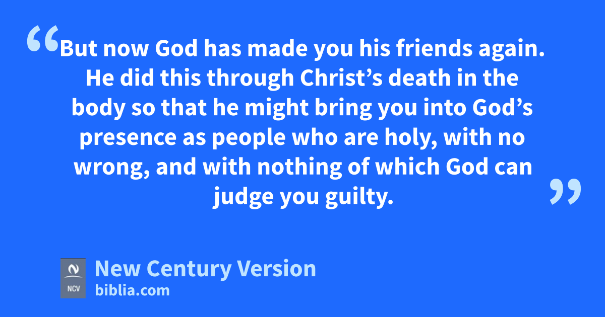 21 At one time you were separated from God. You were his enemies in your minds, and the evil things you did were against God. 22 But now God has made you his friends again. He did this through Christ’s death in the body so that he might bring you into God’s presence as people who are holy, with no wrong, and with nothing of which God can judge you guilty. 23 This will happen if you continue strong and sure in your faith. You must not be moved away from the hope brought to you by the Good News that you heard. That same Good News has been told to everyone in the world, and I, Paul, help in preaching that Good News.