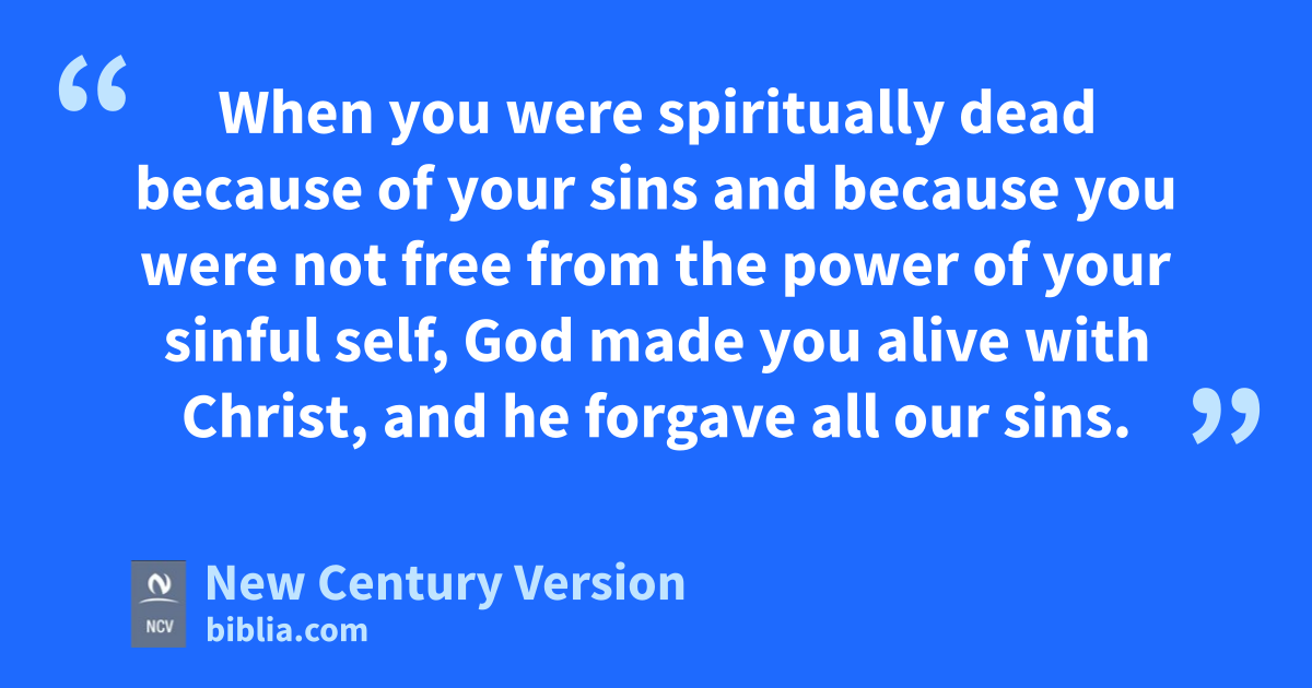 11 Also in Christ you had a different kind of circumcision, a circumcision not done by hands. It was through Christ’s circumcision, that is, his death, that you were made free from the power of your sinful self. 12 When you were baptized, you were buried with Christ, and you were raised up with him through your faith in God’s power that was shown when he raised Christ from the dead. 13 When you were spiritually dead because of your sins and because you were not free from the power of your sinful self, God made you alive with Christ, and he forgave all our sins. 14 He canceled the debt, which listed all the rules we failed to follow. He took away that record with its rules and nailed it to the cross. 15 God stripped the spiritual rulers and powers of their authority. With the cross, he won the victory and showed the world that they were powerless.