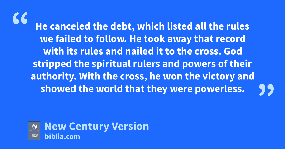 11 Also in Christ you had a different kind of circumcision, a circumcision not done by hands. It was through Christ’s circumcision, that is, his death, that you were made free from the power of your sinful self. 12 When you were baptized, you were buried with Christ, and you were raised up with him through your faith in God’s power that was shown when he raised Christ from the dead. 13 When you were spiritually dead because of your sins and because you were not free from the power of your sinful self, God made you alive with Christ, and he forgave all our sins. 14 He canceled the debt, which listed all the rules we failed to follow. He took away that record with its rules and nailed it to the cross. 15 God stripped the spiritual rulers and powers of their authority. With the cross, he won the victory and showed the world that they were powerless.