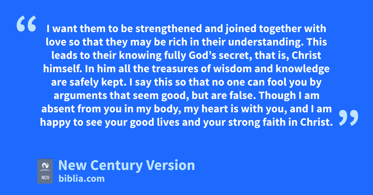 2 I want you to know how hard I work for you, those in Laodicea, and others who have never seen me. 2 I want them to be strengthened and joined together with love so that they may be rich in their understanding. This leads to their knowing fully God’s secret, that is, Christ himself. 3 In him all the treasures of wisdom and knowledge are safely kept.