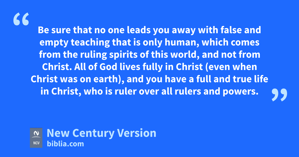 8 Be sure that no one leads you away with false and empty teaching that is only human, which comes from the ruling spirits of this world, and not from Christ. 9 All of God lives fully in Christ (even when Christ was on earth), 10 and you have a full and true life in Christ, who is ruler over all rulers and powers.