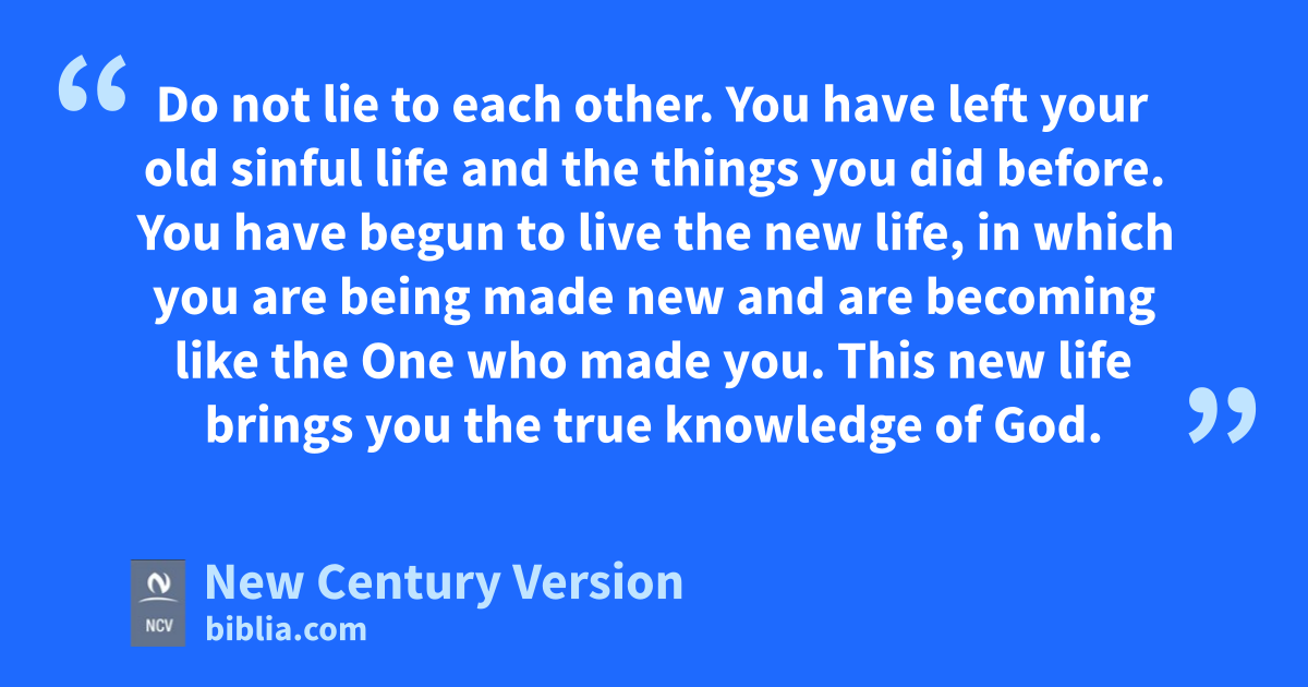 8 But now also put these things out of your life: anger, bad temper, doing or saying things to hurt others, and using evil words when you talk. 9 Do not lie to each other. You have left your old sinful life and the things you did before. 10 You have begun to live the new life, in which you are being made new and are becoming like the One who made you. This new life brings you the true knowledge of God. 11 In the new life there is no difference between Greeks and Jews, those who are circumcised and those who are not circumcised, or people who are foreigners, or Scythians. n There is no difference between slaves and free people. But Christ is in all believers, and Christ is all that is important.