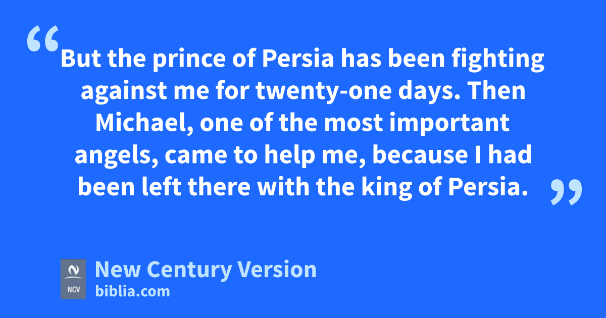 12 Then the man said to me, “Daniel, do not be afraid. Some time ago you decided to get understanding and to humble yourself before your God. Since that time God has listened to you, and I have come because of your prayers. 13 But the prince of Persia has been fighting against me for twenty-one days. Then Michael, one of the most important angels, came to help me, because I had been left there with the king of Persia. 14 Now I have come to explain to you what will happen to your people, because the vision is about a time in the future.”