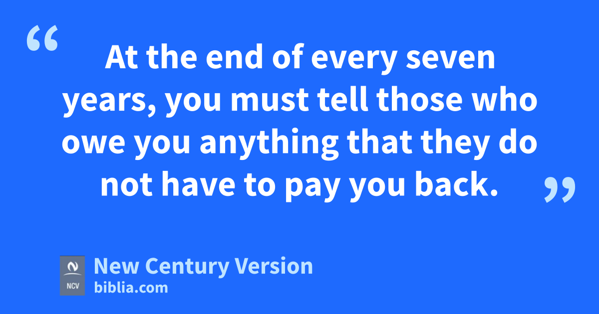 15 At the end of every seven years, you must tell those who owe you anything that they do not have to pay you back. 2 This is how you must do it: Everyone who has loaned money must cancel the loan and not make a neighbor or relative pay it back. This is the Lord’s time for canceling what people owe. 3 You may make a foreigner pay what is owed to you, but you must not collect what another Israelite owes you. 4 But there should be no poor people among you, because the Lord your God will richly bless you in the land he is giving you as your own. 5 He will bless you if you obey the Lord your God completely, but you must be careful to obey all the commands I am giving you today. 6 The Lord your God will bless you as he promised, and you will lend to other nations, but you will not need to borrow from them. You will rule over many nations, but none will rule over you.