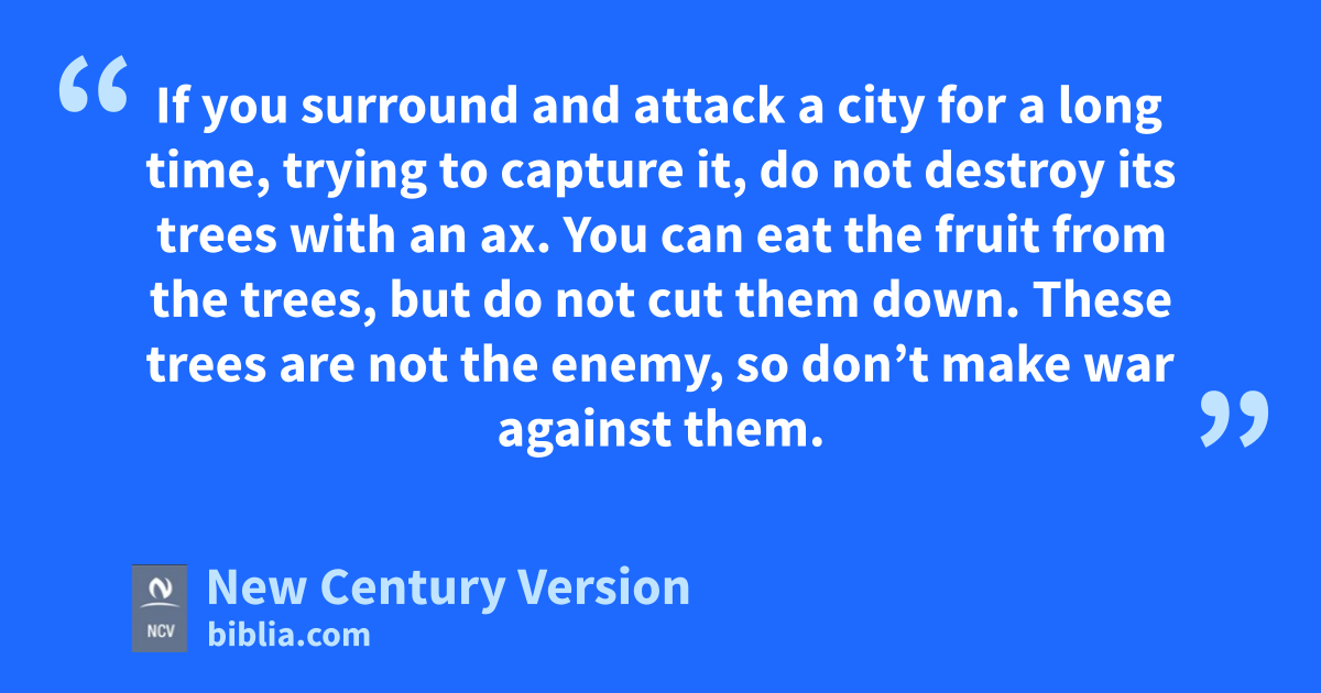 19 If you surround and attack a city for a long time, trying to capture it, do not destroy its trees with an ax. You can eat the fruit from the trees, but do not cut them down. These trees are not the enemy, so don’t make war against them. 20 But you may cut down trees that you know are not fruit trees and use them to build devices to attack the city walls, until the city is captured.