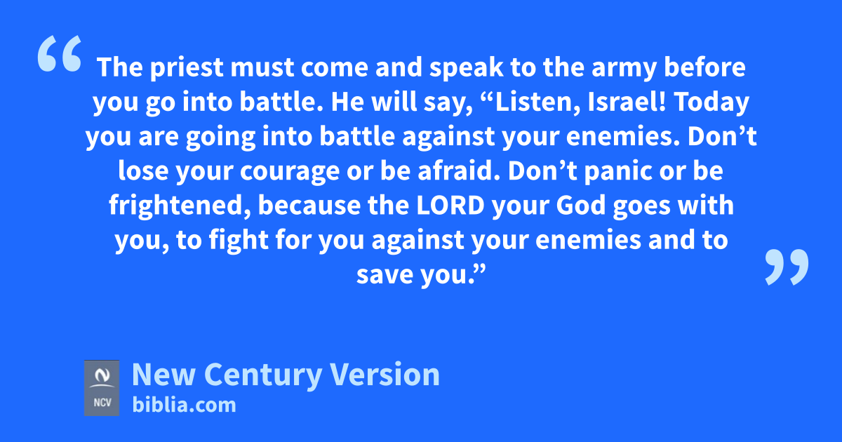 20 When you go to war against your enemies and you see horses and chariots and an army that is bigger than yours, don’t be afraid of them. The Lord your God, who brought you out of Egypt, will be with you. 2 The priest must come and speak to the army before you go into battle. 3 He will say, “Listen, Israel! Today you are going into battle against your enemies. Don’t lose your courage or be afraid. Don’t panic or be frightened, 4 because the Lord your God goes with you, to fight for you against your enemies and to save you.”