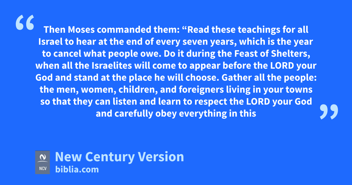 9 So Moses wrote down these teachings and gave them to the priests and all the elders of Israel. (The priests are the sons of Levi, who carry the Ark of the Agreement with the Lord.) 10–11 Then Moses commanded them: “Read these teachings for all Israel to hear at the end of every seven years, which is the year to cancel what people owe. Do it during the Feast of Shelters, when all the Israelites will come to appear before the Lord your God and stand at the place he will choose. 12 Gather all the people: the men, women, children, and foreigners living in your towns so that they can listen and learn to respect the Lord your God and carefully obey everything in this law. 13 Since their children do not know this law, they must hear it. They must learn to respect the Lord your God for as long as they live in the land you are crossing the Jordan River to take for your own.”