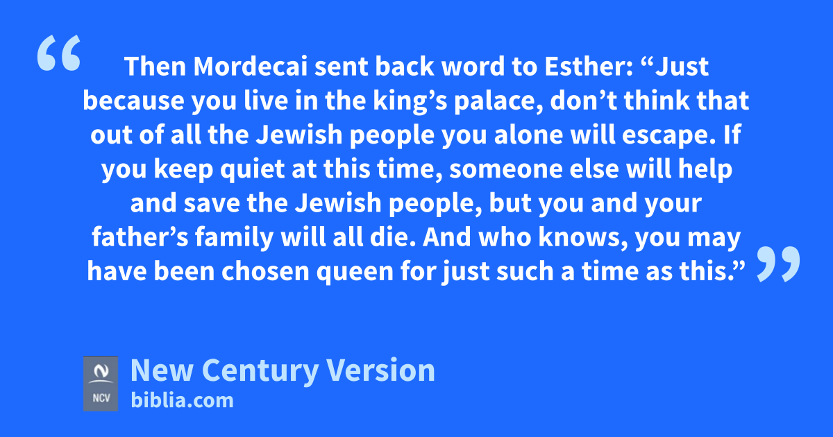 12 Esther’s message was given to Mordecai. 13 Then Mordecai sent back word to Esther: “Just because you live in the king’s palace, don’t think that out of all the Jewish people you alone will escape. 14 If you keep quiet at this time, someone else will help and save the Jewish people, but you and your father’s family will all die. And who knows, you may have been chosen queen for just such a time as this.”