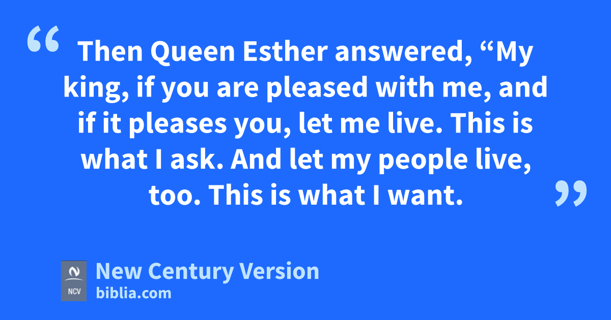 3 Then Queen Esther answered, “My king, if you are pleased with me, and if it pleases you, let me live. This is what I ask. And let my people live, too. This is what I want. 4 My people and I have been sold to be destroyed, to be killed and completely wiped out. If we had been sold as male and female slaves, I would have kept quiet, because that would not be enough of a problem to bother the king.”