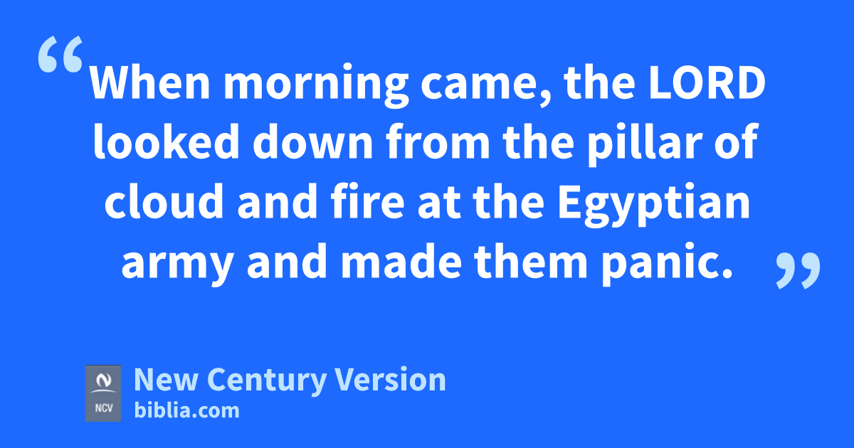 23 Then all the king’s horses, chariots, and chariot drivers followed them into the sea. 24 When morning came, the Lord looked down from the pillar of cloud and fire at the Egyptian army and made them panic. 25 He kept the wheels of the chariots from turning, making it hard to drive the chariots. The Egyptians shouted, “Let’s get away from the Israelites! The Lord is fighting for them and against Egypt.”