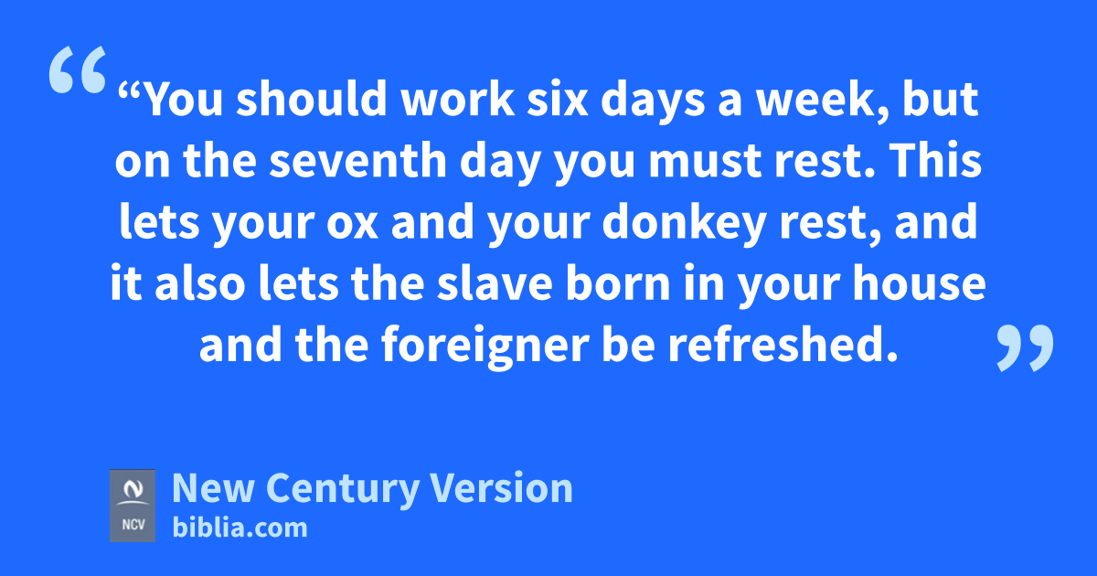 12 “You should work six days a week, but on the seventh day you must rest. This lets your ox and your donkey rest, and it also lets the slave born in your house and the foreigner be refreshed.