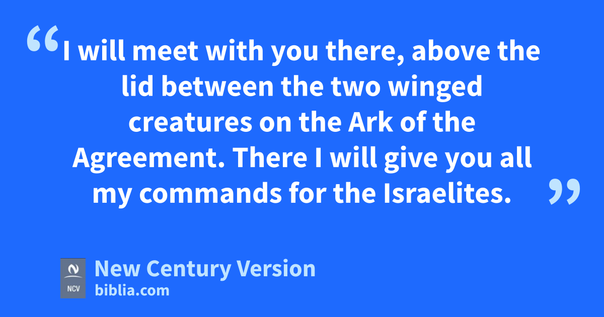 17 “Then make a lid of pure gold for the Ark; this is the mercy seat. Make it forty-five inches long and twenty-seven inches wide. 18 Then hammer gold to make two creatures with wings, and put one on each end of the lid. 19 Attach one creature on one end of the lid and the other creature on the other end. Make them to be one piece with the lid at the ends. 20 The creatures’ wings should be spread upward, covering the lid, and the creatures are to face each other across the lid. 21 Put this lid on top of the Ark, and put in the Ark the Agreement which I will make with you. 22 I will meet with you there, above the lid between the two winged creatures on the Ark of the Agreement. There I will give you all my commands for the Israelites.