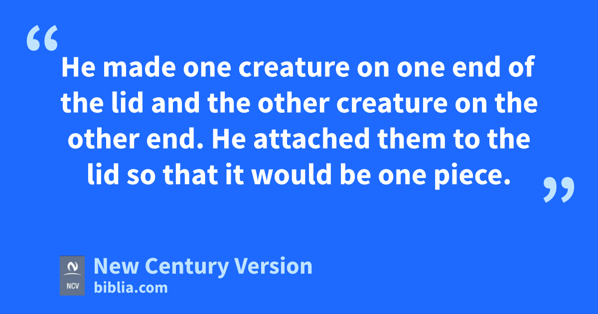 37 Bezalel made the Ark of acacia wood; it was forty-five inches long, twenty-seven inches wide, and twenty-seven inches high. 2 He covered it, both inside and out, with pure gold, and he put a gold strip around it. 3 He made four gold rings for it and attached them to its four feet, with two rings on each side. 4 Then he made poles of acacia wood and covered them with gold. 5 He put the poles through the rings on each side of the Ark to carry it. 6 Then he made a lid of pure gold that was forty-five inches long and twenty-seven inches wide. 7 Then Bezalel hammered gold to make two creatures with wings and attached them to each end of the lid. 8 He made one creature on one end of the lid and the other creature on the other end. He attached them to the lid so that it would be one piece. 9 The creatures’ wings were spread upward, covering the lid, and the creatures faced each other across the lid.