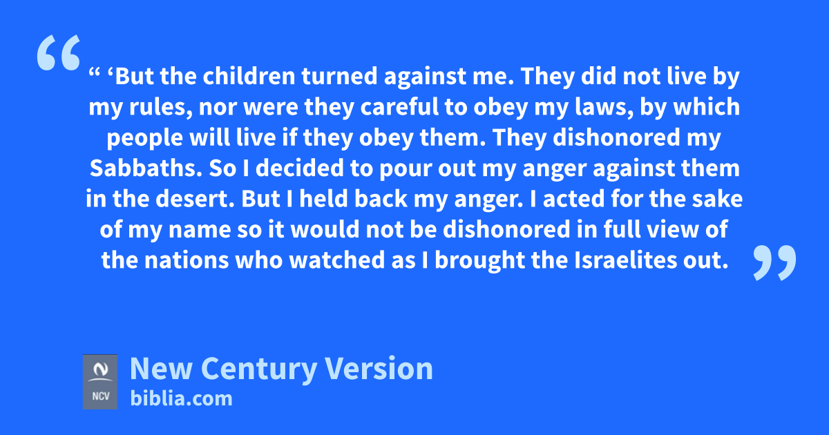 13 “ ‘But in the desert Israel turned against me. They did not follow my rules, and they rejected my laws, by which people will live if they obey them. They dishonored my Sabbaths. Then I decided to pour out my anger against them and destroy them in the desert. 14 But I acted for the sake of my name so it would not be dishonored in full view of the nations who watched as I had brought the Israelites out of Egypt. 15 And in the desert I swore to the Israelites that I would not bring them into the land I had given them. It is a fertile land, the best land in the world. 16 This was because they rejected my laws and did not follow my rules. They dishonored my Sabbaths and wanted to worship their idols. 17 But I had pity on them. I did not destroy them or put an end to them in the desert. 18 I said to their children in the desert, “Don’t live by the rules of your parents, or obey their laws. Don’t make yourselves unclean with their idols. 19 I am the Lord your God. Live by my rules, obey my laws, and follow them. 20 Keep my Sabbaths holy, and they will be a sign between me and you. Then you will know that I am the Lord your God.”
