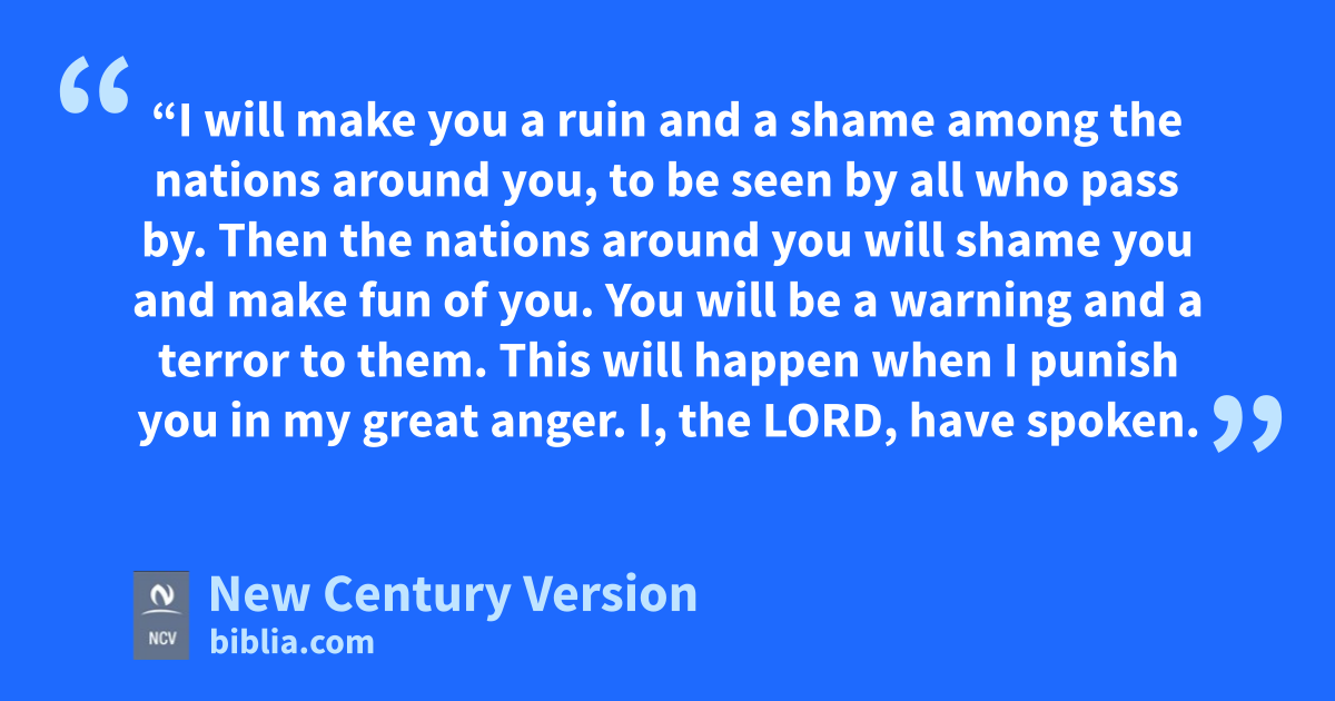 14 “I will make you a ruin and a shame among the nations around you, to be seen by all who pass by. 15 Then the nations around you will shame you and make fun of you. You will be a warning and a terror to them. This will happen when I punish you in my great anger. I, the Lord, have spoken. 16 I will send a time of hunger to destroy you, and then I will make your hunger get even worse, and I will cut off your supply of food. 17 I will send a time of hunger and wild animals against you, and they will kill your children. Disease and death will sweep through your people, and I will bring the sword against you to kill you. I, the Lord, have spoken.”