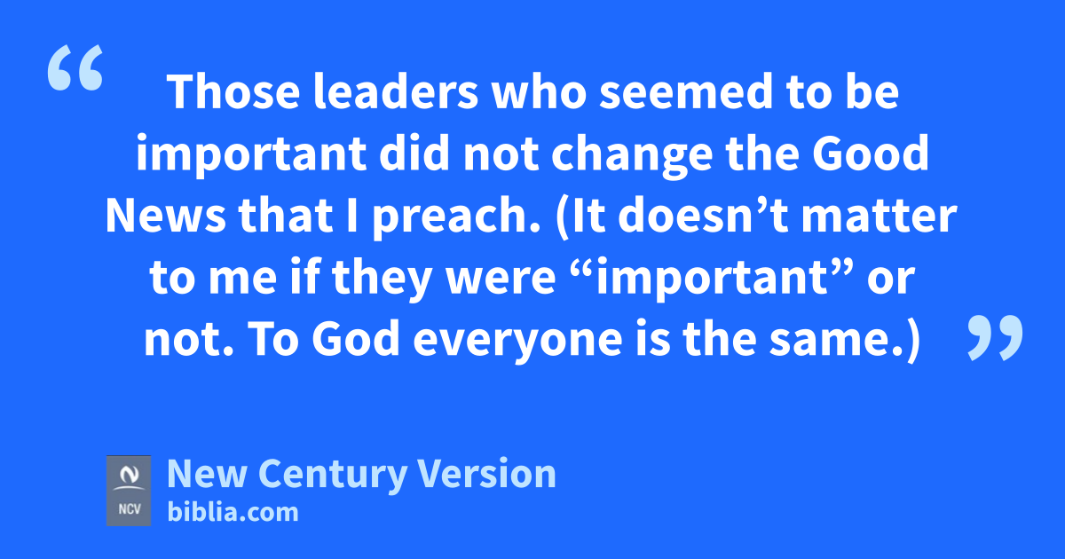 6 Those leaders who seemed to be important did not change the Good News that I preach. (It doesn’t matter to me if they were “important” or not. To God everyone is the same.) 7 But these leaders saw that I had been given the work of telling the Good News to those who are not Jewish, just as Peter had the work of telling the Jews. 8 God gave Peter the power to work as an apostle for the Jewish people. But he also gave me the power to work as an apostle for those who are not Jews. 9 James, Peter, and John, who seemed to be the leaders, understood that God had given me this special grace, so they accepted Barnabas and me. They agreed that they would go to the Jewish people and that we should go to those who are not Jewish. 10 The only thing they asked us was to remember to help the poor—something I really wanted to do.