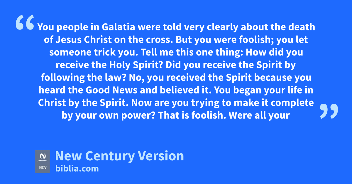 3 You people in Galatia were told very clearly about the death of Jesus Christ on the cross. But you were foolish; you let someone trick you. 2 Tell me this one thing: How did you receive the Holy Spirit? Did you receive the Spirit by following the law? No, you received the Spirit because you heard the Good News and believed it. 3 You began your life in Christ by the Spirit. Now are you trying to make it complete by your own power? That is foolish. 4 Were all your experiences wasted? I hope not! 5 Does God give you the Spirit and work miracles among you because you follow the law? No, he does these things because you heard the Good News and believed it.
