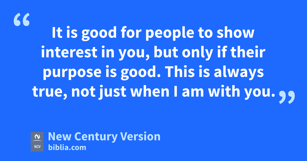 17 Those people n are working hard to persuade you, but this is not good for you. They want to persuade you to turn against us and follow only them. 18 It is good for people to show interest in you, but only if their purpose is good. This is always true, not just when I am with you. 19 My little children, again I feel the pain of childbirth for you until you truly become like Christ. 20 I wish I could be with you now and could change the way I am talking to you, because I do not know what to think about you.