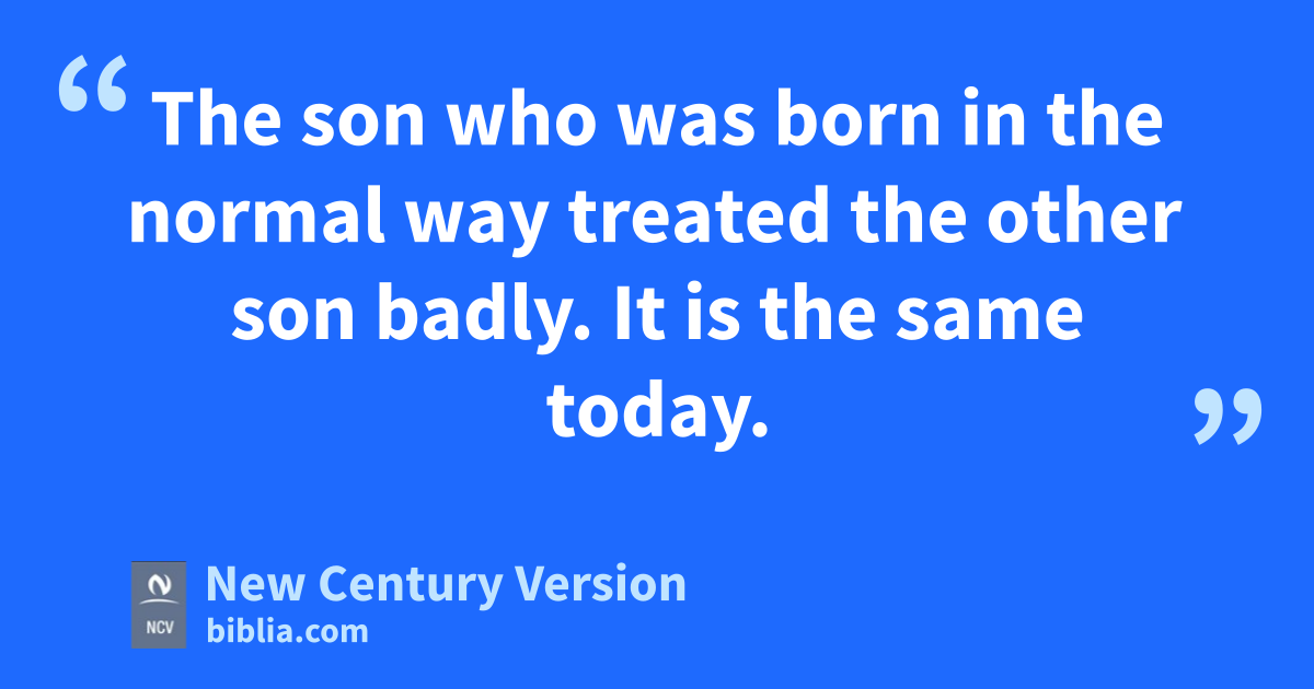 28 My brothers and sisters, you are God’s children because of his promise, as Isaac was then. 29 The son who was born in the normal way treated the other son badly. It is the same today. 30 But what does the Scripture say? “Throw out the slave woman and her son. The son of the slave woman should not inherit anything. The son of the free woman should receive it all.” n 31 So, my brothers and sisters, we are not children of the slave woman, but of the free woman.