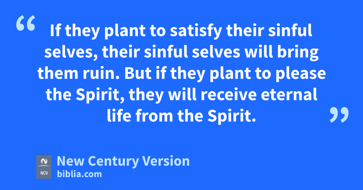 7 Do not be fooled: You cannot cheat God. People harvest only what they plant. 8 If they plant to satisfy their sinful selves, their sinful selves will bring them ruin. But if they plant to please the Spirit, they will receive eternal life from the Spirit. 9 We must not become tired of doing good. We will receive our harvest of eternal life at the right time if we do not give up. 10 When we have the opportunity to help anyone, we should do it. But we should give special attention to those who are in the family of believers.