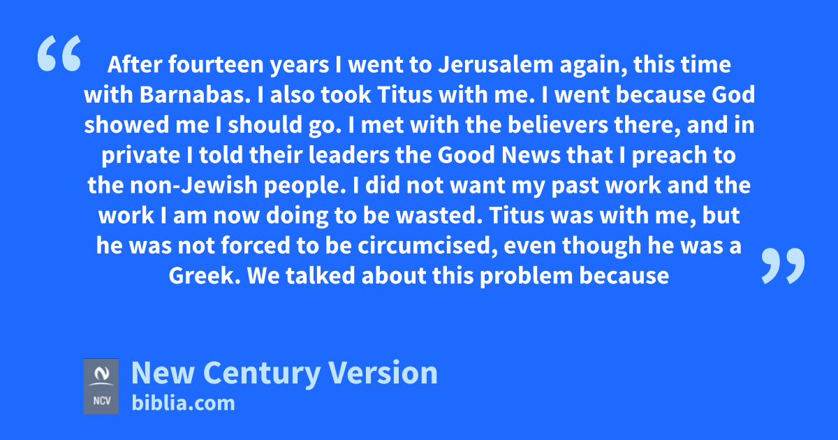 2 After fourteen years I went to Jerusalem again, this time with Barnabas. I also took Titus with me. 2 I went because God showed me I should go. I met with the believers there, and in private I told their leaders the Good News that I preach to the non-Jewish people. I did not want my past work and the work I am now doing to be wasted. 3 Titus was with me, but he was not forced to be circumcised, even though he was a Greek. 4 We talked about this problem because some false believers had come into our group secretly. They came in like spies to overturn the freedom we have in Christ Jesus. They wanted to make us slaves. 5 But we did not give in to those false believers for a minute. We wanted the truth of the Good News to continue for you.