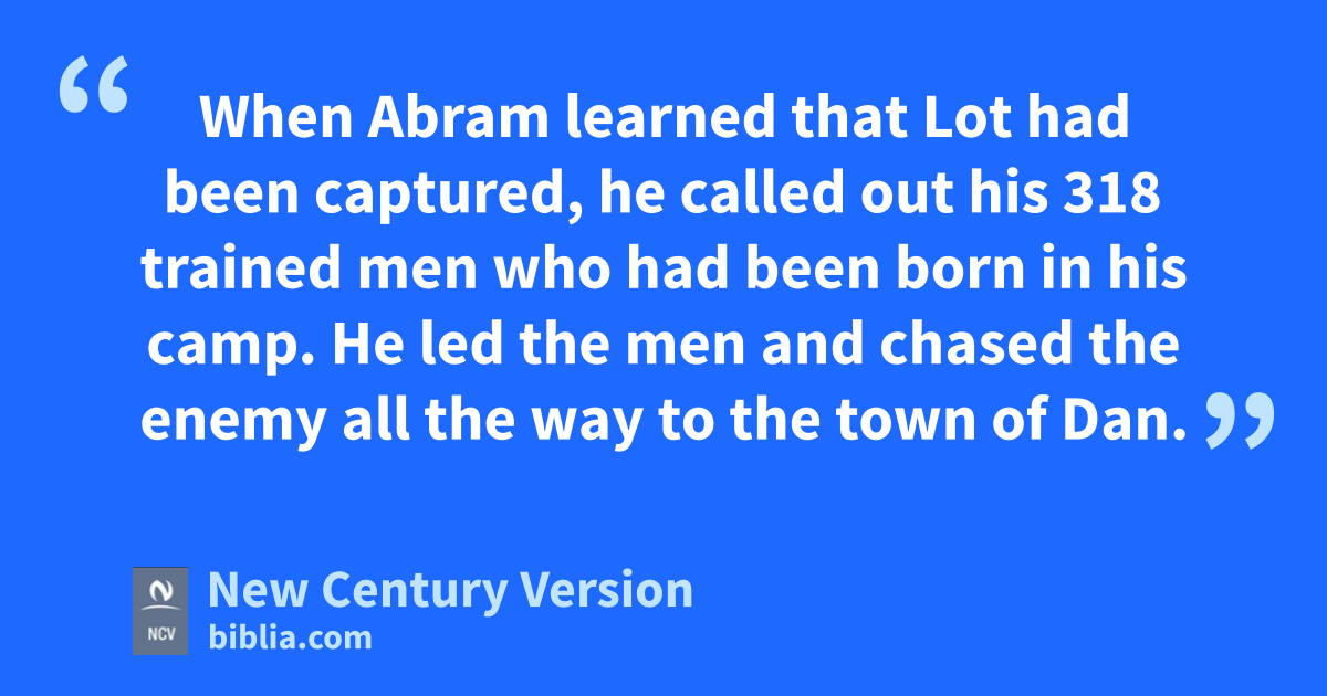 14 When Abram learned that Lot had been captured, he called out his 318 trained men who had been born in his camp. He led the men and chased the enemy all the way to the town of Dan. 15 That night he divided his men into groups, and they made a surprise attack against the enemy. They chased them all the way to Hobah, north of Damascus. 16 Then Abram brought back everything the enemy had stolen, the women and the other people, and Lot, and everything Lot owned.
