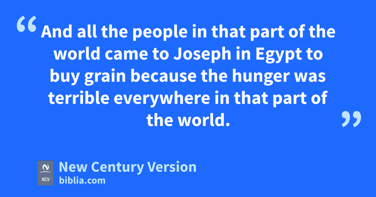 56 The hunger was everywhere in that part of the world. And Joseph opened the storehouses and sold grain to the people of Egypt, because the time of hunger became terrible in Egypt. 57 And all the people in that part of the world came to Joseph in Egypt to buy grain because the hunger was terrible everywhere in that part of the world.