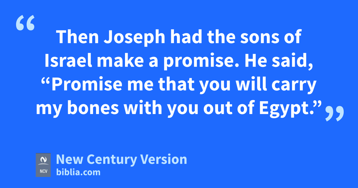 24 Joseph said to his brothers, “I am about to die, but God will take care of you. He will lead you out of this land to the land he promised to Abraham, Isaac, and Jacob.” 25 Then Joseph had the sons of Israel make a promise. He said, “Promise me that you will carry my bones with you out of Egypt.”