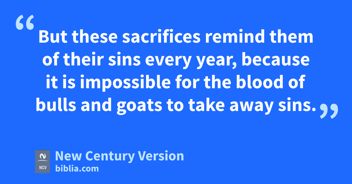 10 The law is only an unclear picture of the good things coming in the future; it is not the real thing. The people under the law offer the same sacrifices every year, but these sacrifices can never make perfect those who come near to worship God. 2 If the law could make them perfect, the sacrifices would have already stopped. The worshipers would be made clean, and they would no longer have a sense of sin. 3 But these sacrifices remind them of their sins every year, 4 because it is impossible for the blood of bulls and goats to take away sins.