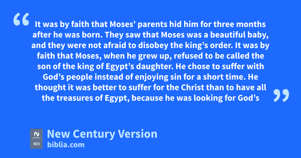 24 It was by faith that Moses, when he grew up, refused to be called the son of the king of Egypt’s daughter. 25 He chose to suffer with God’s people instead of enjoying sin for a short time. 26 He thought it was better to suffer for the Christ than to have all the treasures of Egypt, because he was looking for God’s reward. 27 It was by faith that Moses left Egypt and was not afraid of the king’s anger. Moses continued strong as if he could see the God that no one can see. 28 It was by faith that Moses prepared the Passover and spread the blood on the doors so the one who brings death would not kill the firstborn sons of Israel.