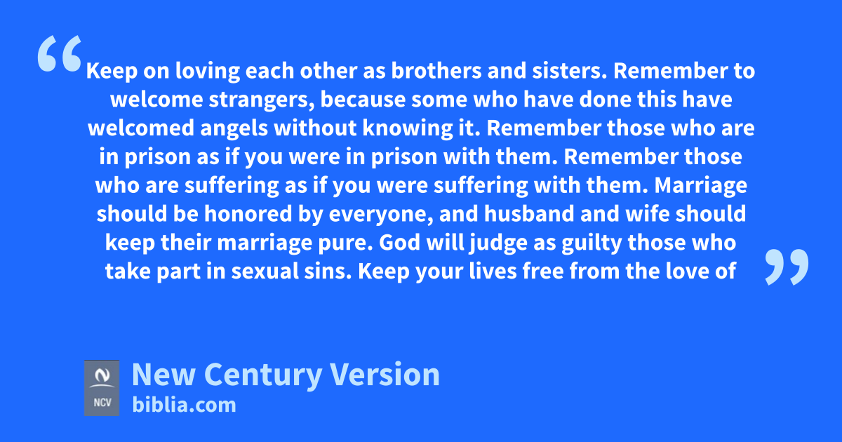 13 Keep on loving each other as brothers and sisters. 2 Remember to welcome strangers, because some who have done this have welcomed angels without knowing it. 3 Remember those who are in prison as if you were in prison with them. Remember those who are suffering as if you were suffering with them.