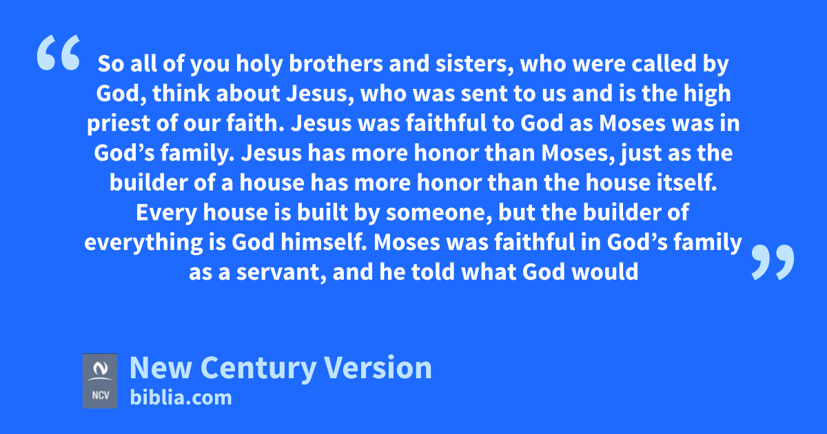 3 So all of you holy brothers and sisters, who were called by God, think about Jesus, who was sent to us and is the high priest of our faith. 2 Jesus was faithful to God as Moses was in God’s family. 3 Jesus has more honor than Moses, just as the builder of a house has more honor than the house itself. 4 Every house is built by someone, but the builder of everything is God himself. 5 Moses was faithful in God’s family as a servant, and he told what God would say in the future. 6 But Christ is faithful as a Son over God’s house. And we are God’s house if we confidently maintain our hope.