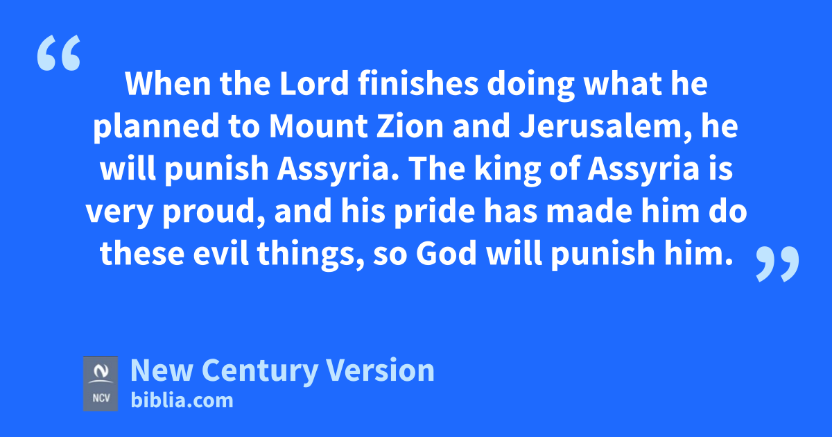 12 When the Lord finishes doing what he planned to Mount Zion and Jerusalem, he will punish Assyria. The king of Assyria is very proud, and his pride has made him do these evil things, so God will punish him. 13 The king of Assyria says this: