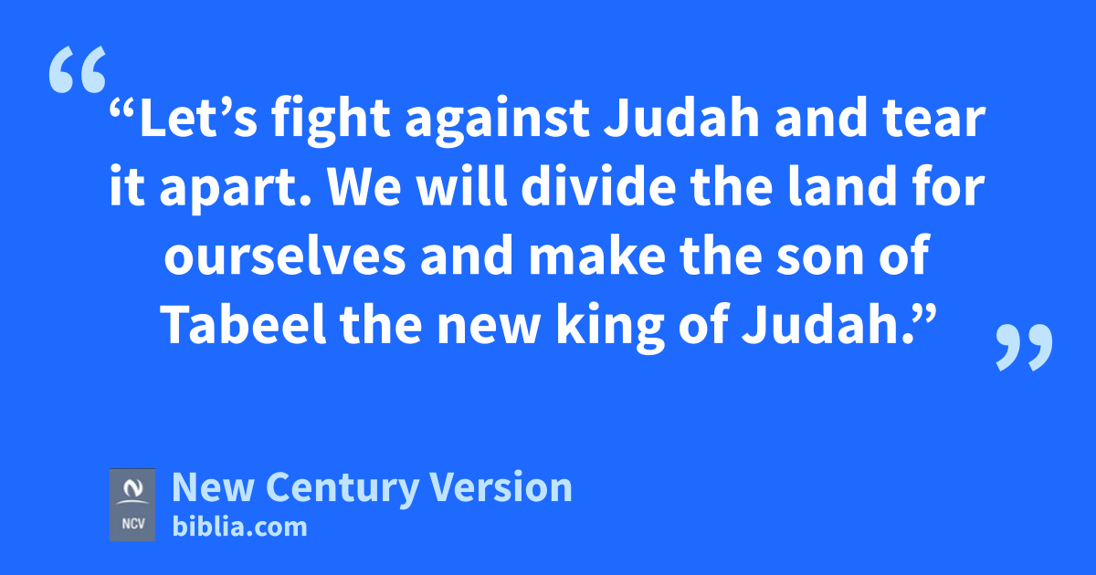 3 Then the Lord told Isaiah, “You and your son Shear-Jashub n should go and meet Ahaz at the place where the water flows into the upper pool, on the road where people do their laundry. 4 Tell Ahaz, ‘Be careful. Be calm and don’t worry. Don’t let those two men, Rezin and Pekah son of Remaliah, scare you. Don’t be afraid of their anger or Aram’s anger, because they are like two barely burning sticks that are ready to go out. 5 They have made plans against you, saying, 6 “Let’s fight against Judah and tear it apart. We will divide the land for ourselves and make the son of Tabeel the new king of Judah.” 7 But I, the Lord God, say,