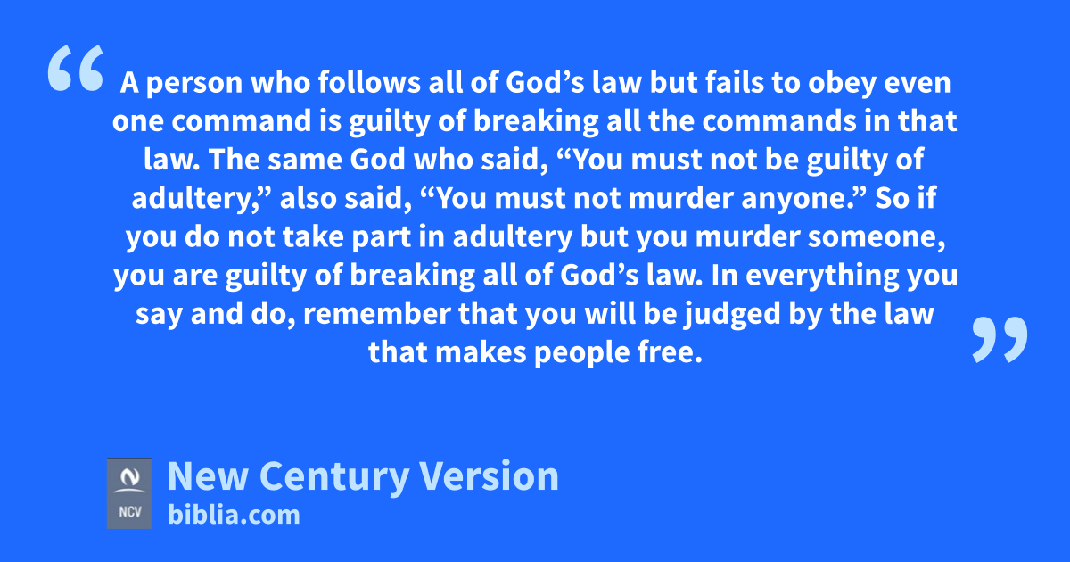 8 This royal law is found in the Scriptures: “Love your neighbor as you love yourself.” n If you obey this law, you are doing right. 9 But if you treat one person as being more important than another, you are sinning. You are guilty of breaking God’s law. 10 A person who follows all of God’s law but fails to obey even one command is guilty of breaking all the commands in that law. 11 The same God who said, “You must not be guilty of adultery,” n also said, “You must not murder anyone.” n So if you do not take part in adultery but you murder someone, you are guilty of breaking all of God’s law. 12 In everything you say and do, remember that you will be judged by the law that makes people free. 13 So you must show mercy to others, or God will not show mercy to you when he judges you. But the person who shows mercy can stand without fear at the judgment.