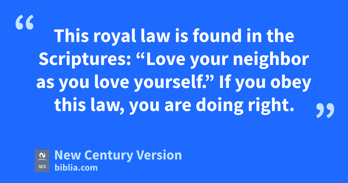 8 This royal law is found in the Scriptures: “Love your neighbor as you love yourself.” n If you obey this law, you are doing right. 9 But if you treat one person as being more important than another, you are sinning. You are guilty of breaking God’s law. 10 A person who follows all of God’s law but fails to obey even one command is guilty of breaking all the commands in that law. 11 The same God who said, “You must not be guilty of adultery,” n also said, “You must not murder anyone.” n So if you do not take part in adultery but you murder someone, you are guilty of breaking all of God’s law. 12 In everything you say and do, remember that you will be judged by the law that makes people free. 13 So you must show mercy to others, or God will not show mercy to you when he judges you. But the person who shows mercy can stand without fear at the judgment.