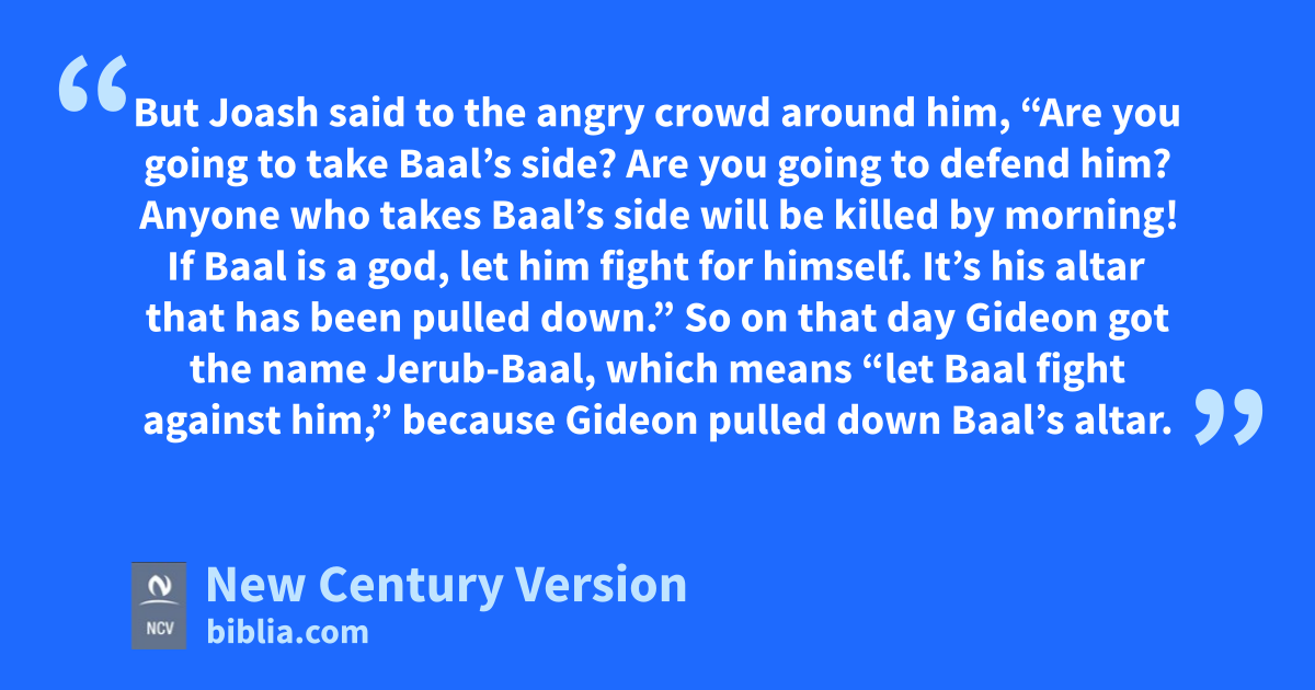 31 But Joash said to the angry crowd around him, “Are you going to take Baal’s side? Are you going to defend him? Anyone who takes Baal’s side will be killed by morning! If Baal is a god, let him fight for himself. It’s his altar that has been pulled down.” 32 So on that day Gideon got the name Jerub-Baal, which means “let Baal fight against him,” because Gideon pulled down Baal’s altar.