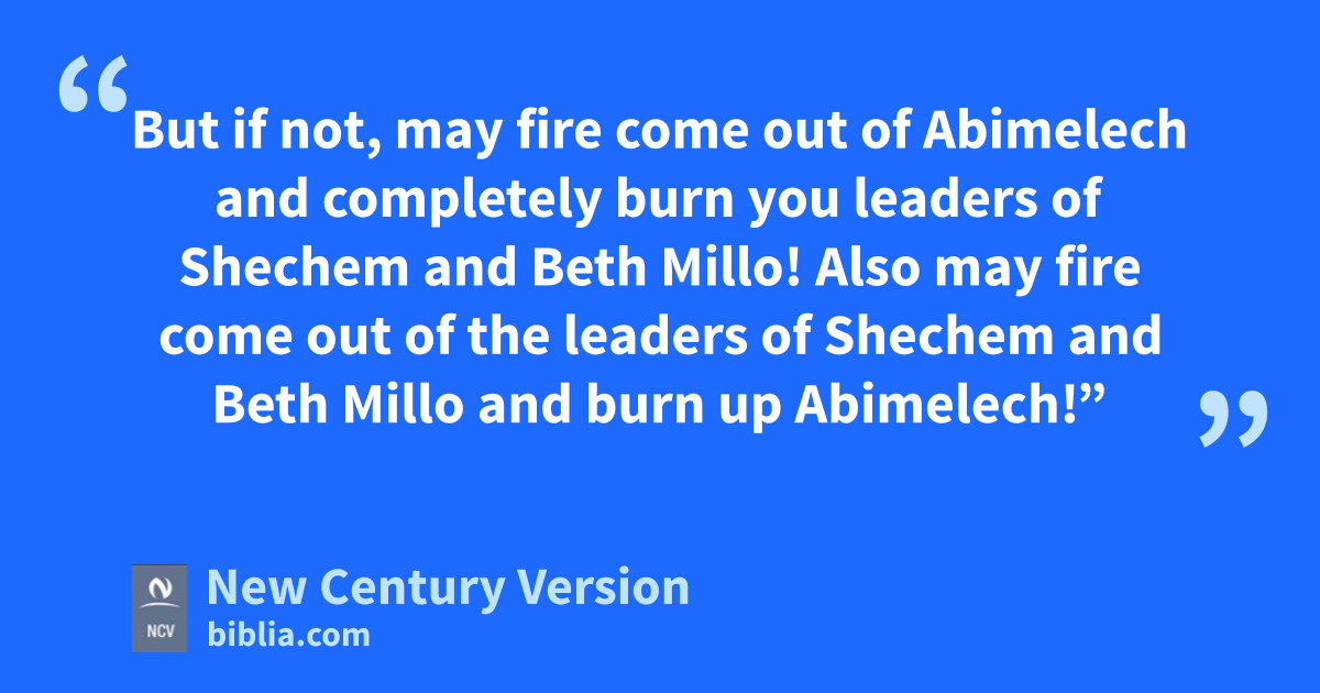 16 “Now, were you completely honest and sincere when you made Abimelech king? Have you been fair to Gideon n and his family? Have you treated Gideon as you should? 17 Remember, my father fought for you and risked his life to save you from the power of the Midianites. 18 But now you have turned against my father’s family and have killed his seventy sons on one stone. You have made Abimelech, the son of my father’s slave girl, king over the leaders of Shechem just because he is your relative! 19 So then, if you have been honest and sincere to Gideon and his family today, be happy with Abimelech as your king. And may he be happy with you! 20 But if not, may fire come out of Abimelech and completely burn you leaders of Shechem and Beth Millo! Also may fire come out of the leaders of Shechem and Beth Millo and burn up Abimelech!”
