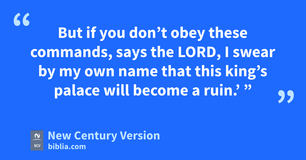 22 This is what the Lord says: “Go down to the palace of the king of Judah and prophesy this message there: 2 ‘Hear the word of the Lord, king of Judah, who rules from David’s throne. You and your officers, and your people who come through these gates, listen! 3 This is what the Lord says: Do what is fair and right. Save the one who has been robbed from the power of his attacker. Don’t mistreat or hurt the foreigners, orphans, or widows. Don’t kill innocent people here. 4 If you carefully obey these commands, kings who sit on David’s throne will come through the gates of this palace with their officers and people, riding in chariots and on horses. 5 But if you don’t obey these commands, says the Lord, I swear by my own name that this king’s palace will become a ruin.’ ”